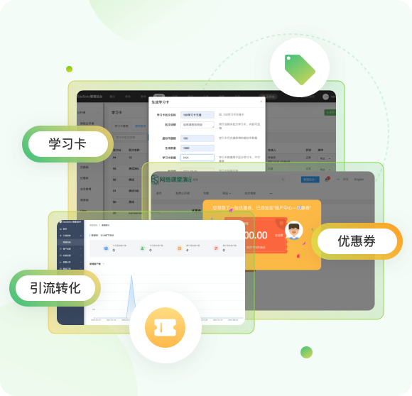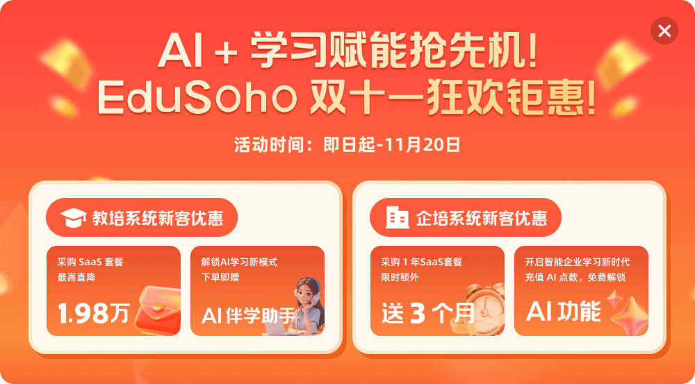 EduSoho 教育云 + AI 基座 拼團、秒殺、兌換碼、學習卡、公開課,多樣化的營銷工具,幫助培訓機構實現(xiàn)全渠道引流及轉化。